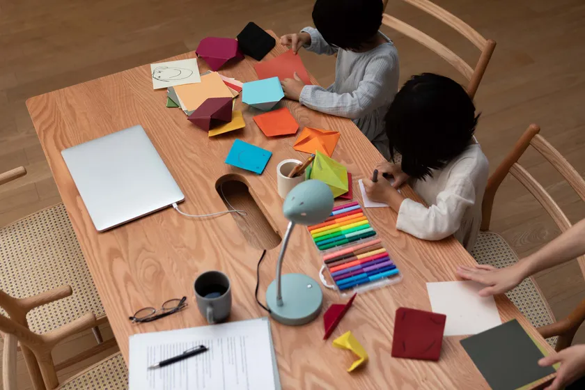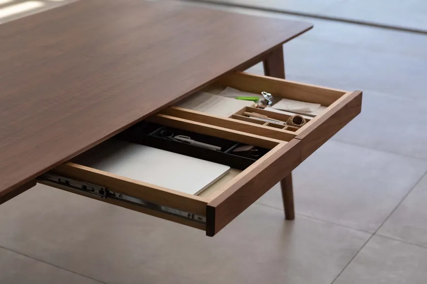 卓上に出しっぱなしになりがちな物をさっとしまえる、大容量の引出しを備えたダイニングテーブル