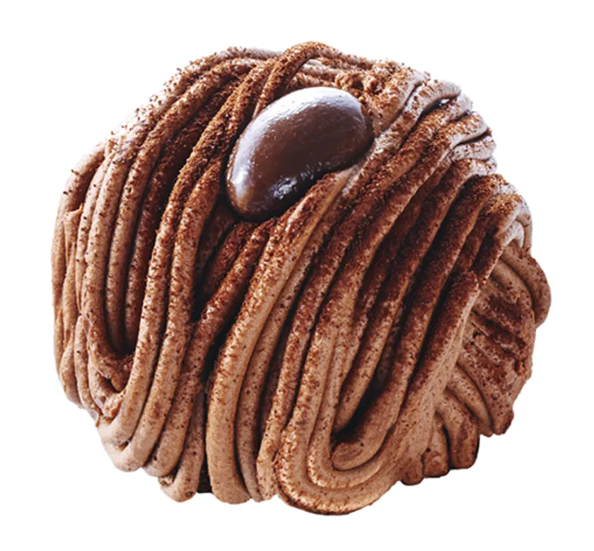 チョコレートを贅沢に使用した三層仕立てのモンブラン。ふんわりココアのスポンジ生地に軽いくちどけのチョコレートホイップ、隠し味のイチゴソース、仕上げに全体を覆いつくすように濃厚なチョコレートクリームを絞りました。トップに添えたアーモンドチョコレートが食感のアクセント。濃厚なチョコレートと甘酸っぱいイチゴソースの相性が抜群です。チョコレート好きにはたまらない一品です。