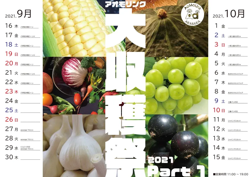 アオモリンク赤坂は、「アオモリンク赤坂大収穫祭」と題し、2021年9月より秋にかけて収穫時期を迎える地元農家のこだわりの農産物やりんごなどを中心に産地直送で販売いたします。