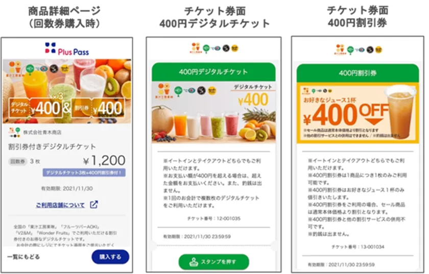 9月7日(火)より販売を行っている『割引券付きデジタルチケット』は、当社フルーツジュースバーで提供するジュース購入時に利用可能な割引券付きの回数券です。「400円デジタルチケット」3枚(1,200円)ご購入時に、同じく対象店舗でのジュース購入時に利用可能な「400円割引券」が付与されるため、実質3枚分の価格で4枚分ご購入いたただける大変お得な回数券です。