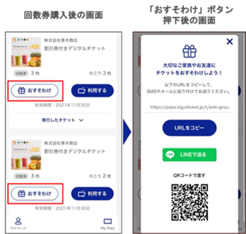 回数券をご購入された方は、LINE等のSNSやメールで、おすそわけする回数券のURLをコピーして送信することで、家族や友人に回数券を1枚単位でプレゼントすることができます。