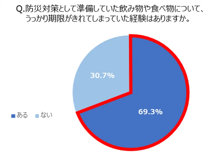 日ごろから防災対策を行っているママたちに、防災用に準備していた飲食料品をうっかり賞味期限切れさせたことがあるかどうか聞いてみたところ、なんと約7割の69.3%が「ある」と回答しています。