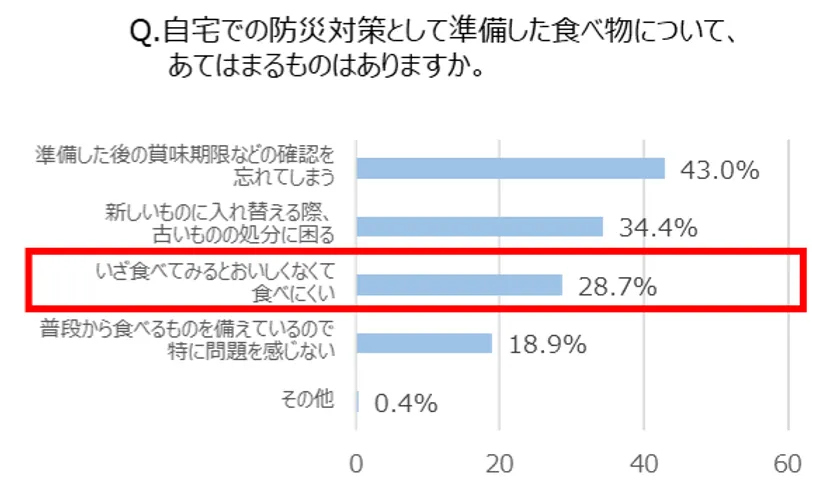 本調査では、自宅での防災対策として飲み物や食べ物を準備しているかどうかを伺ったところ、日ごろから飲食料品を備えているママたちは2人に1人という結果がわかりました。防災用に飲食料品を準備していると答えたママたちに防災用の飲食料品をうっかり賞味期限切れさせたことがあるかどうかを聞いてみたところ、約7割の69.3%が「ある」と回答しています。また、飲食料品のストックについて、「準備した後の賞味期限などの確認を忘れてしまう」(43.0%)、「いざ食べてみるとおいしくなくて食べにくい」(28.7%)という声も聞かれました。