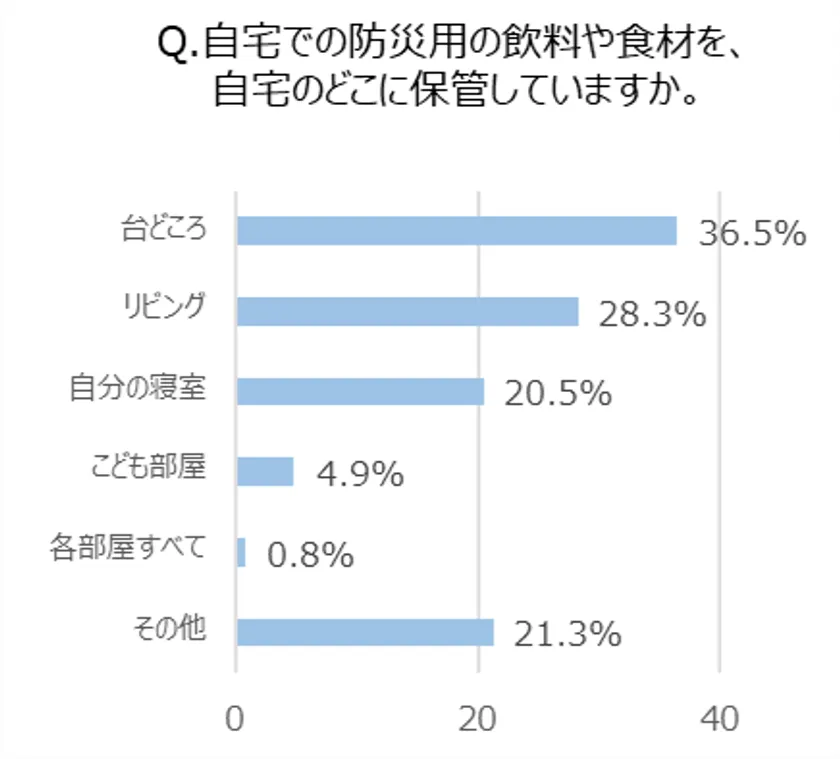 防災用の飲料や食材の保管場所についてお伺いしたところ、最も多い回答が「台どころ」(36.5%)、次いで「リビング」(28.3%)です。