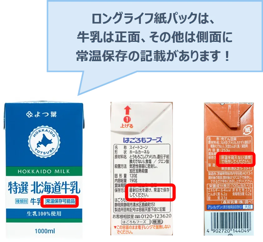 ロングライフ紙パックは、牛乳は正面、その他は側面に常温保存の記載があります