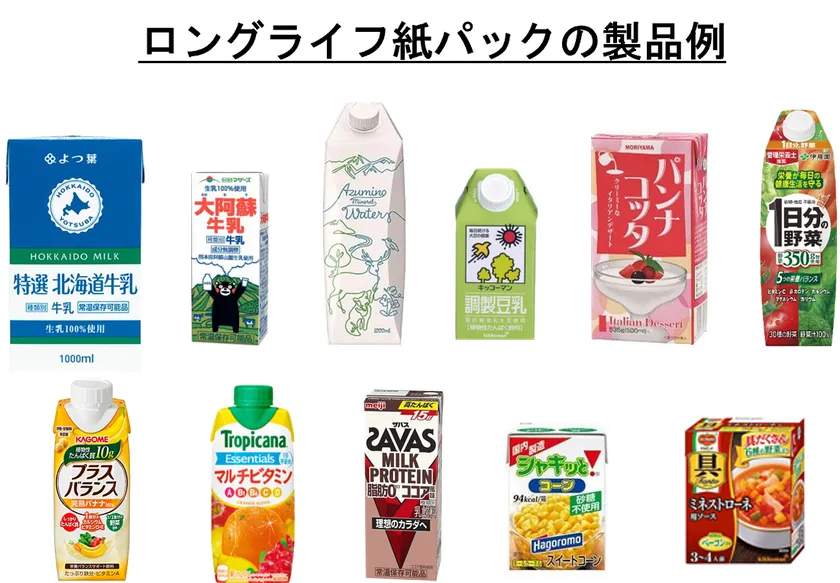 ロングライフ紙パックは、あまり聞きなれない名前ですが、実はほぼすべての人が一度は手にしたことがあるくらい、身近な紙パックです。野菜・果物ジュース、豆腐やパンナコッタなどの食品、牛乳・乳飲料、飲料水、コーヒーやお茶、栄養補助飲料、レトルト食品など、幅広い食品を包んでいます。