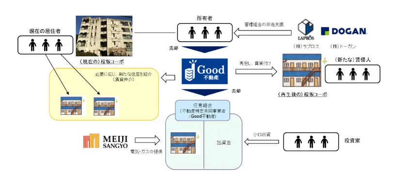 そこで、当社と事業パートナーは、主に中小規模の分譲マンションの管理組合を対象に、マンションの再生に向けた伴走支援を行ってきました。物件の再生が行われた後に、Good不動産が有する不動産特定共同事業許可(1号・2号)を活用して保有区分建物を小口化し、投資家を募る予定です(※2)。この取組を通じ、当社と事業パートナーは、地域のお金を使って高経年化したマンションを再生し、住みよい地域を作り、地域で持続的にお金と人が回る仕組み(エコシステム)を作りたいと考えており、ひいては、国連にて採択されたSDGs(特に「目標11:住み続けられるまちづくりを」)の達成にも資する取組と考えております。