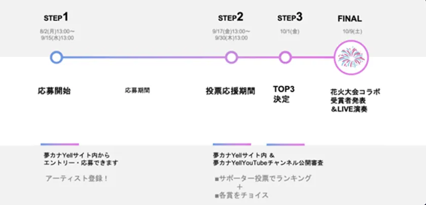 応援してほしい人と応援したい人が繋がる「夢カナYell」を活用して、応援してくれるファンを獲得し、夢への新しい未来を描こう!優秀作品は、夢カナYellとのコラボでミュージックビデオ制作のチャンスを用意しています。