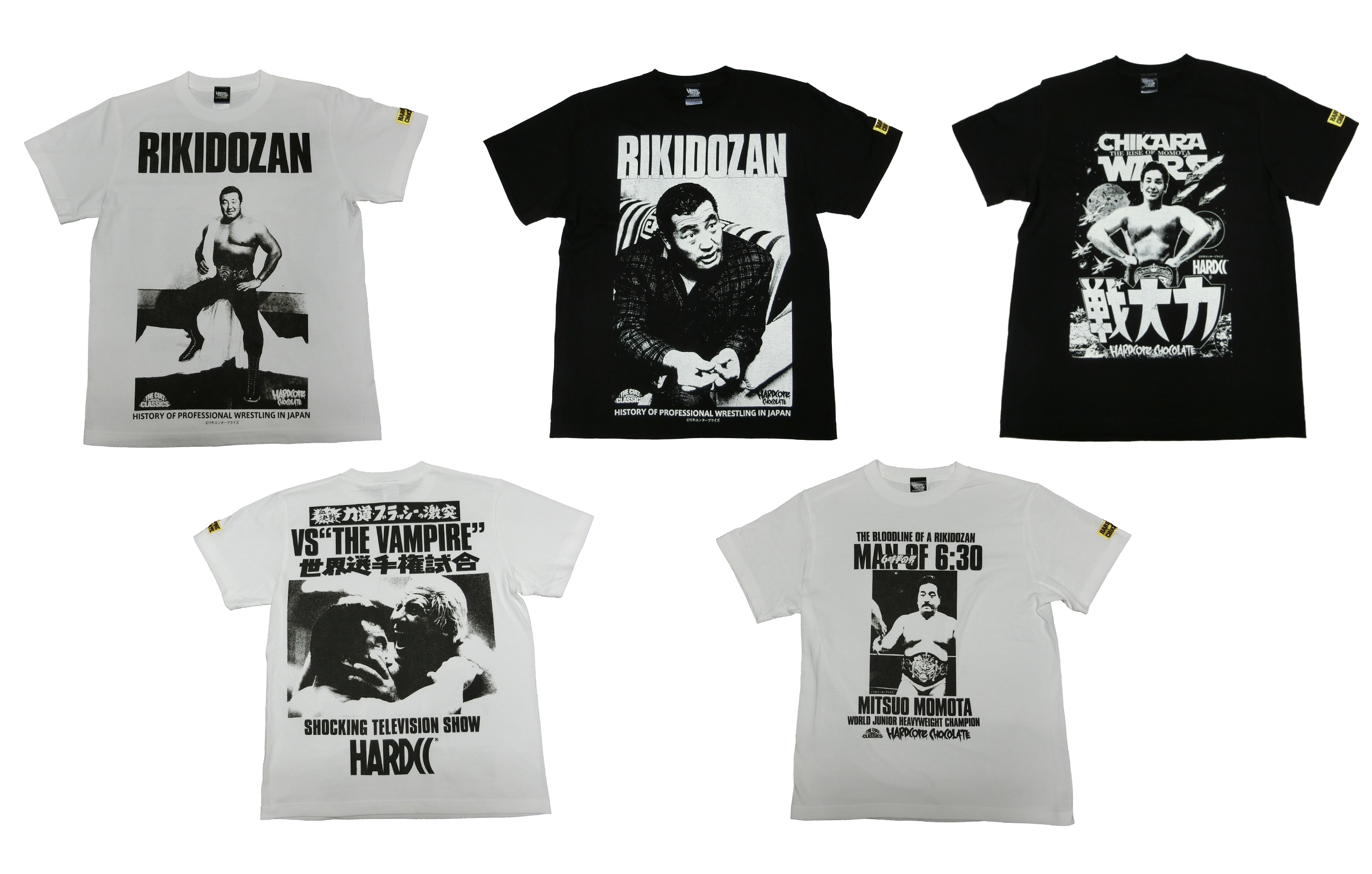 有限会社ハードコアチョコレート(本社:東京都中野区、代表取締役:宗方雅也、以下 ハードコアチョコレート)は、有限会社リキエンタープライズとのコラボレーション商品として、力道山、百田光雄、百田力のコラボレーションTシャツ4種を2021年9月に発売いたしました。