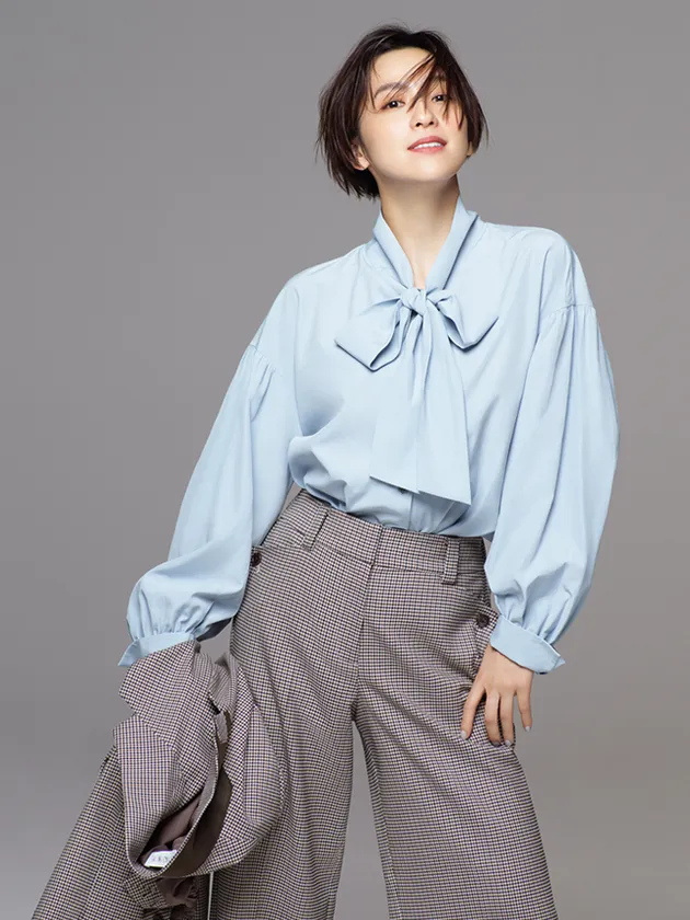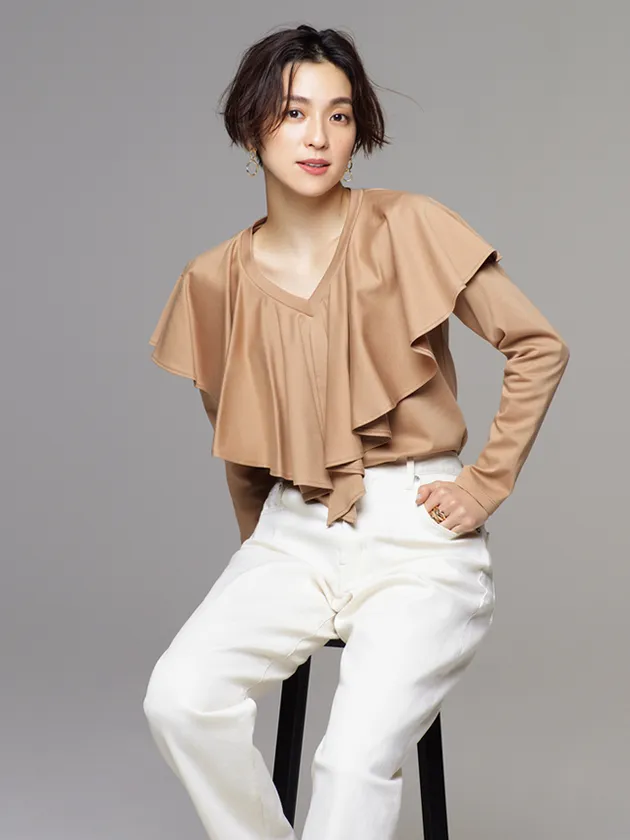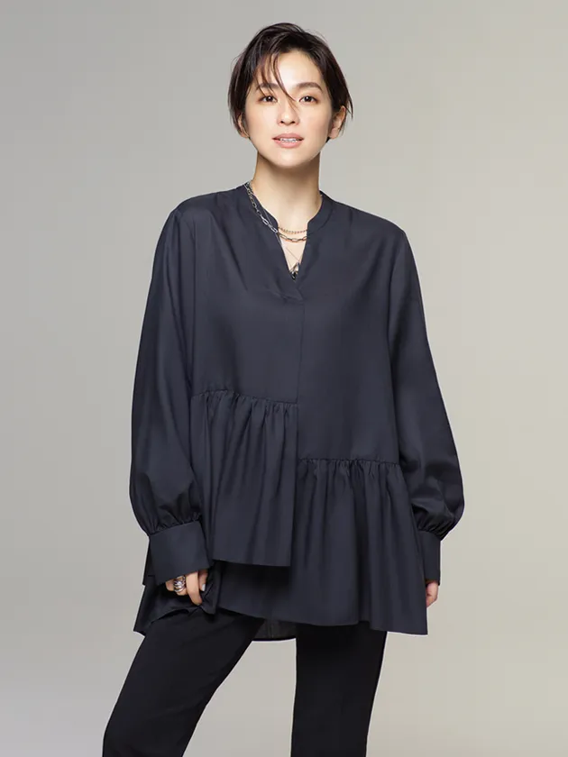 トレンドのティアードブラウスをハンサムに。