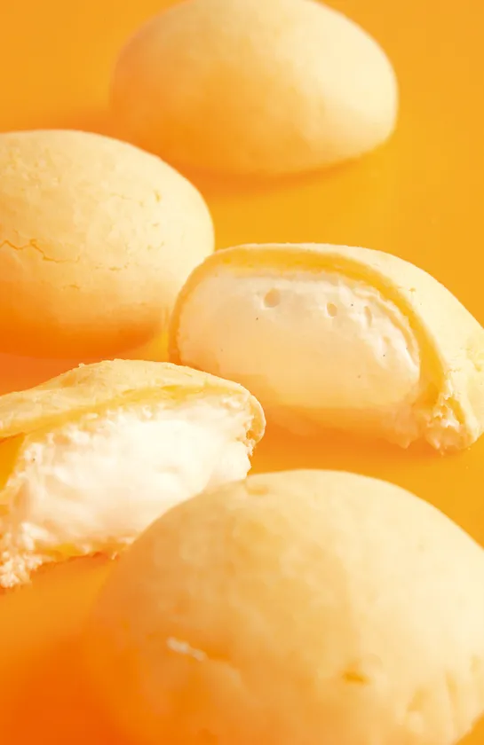 シュー生地の中にはやさしい甘さのクリームを贅沢にたっぷりと。口に入れるともっちりとろ~り、美味しいしあわせが口いっぱいに広がります。