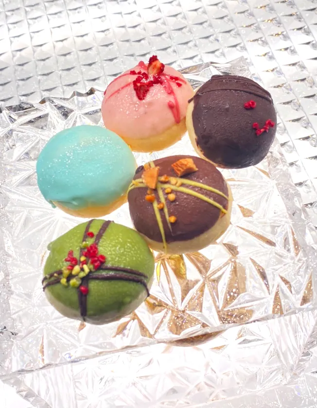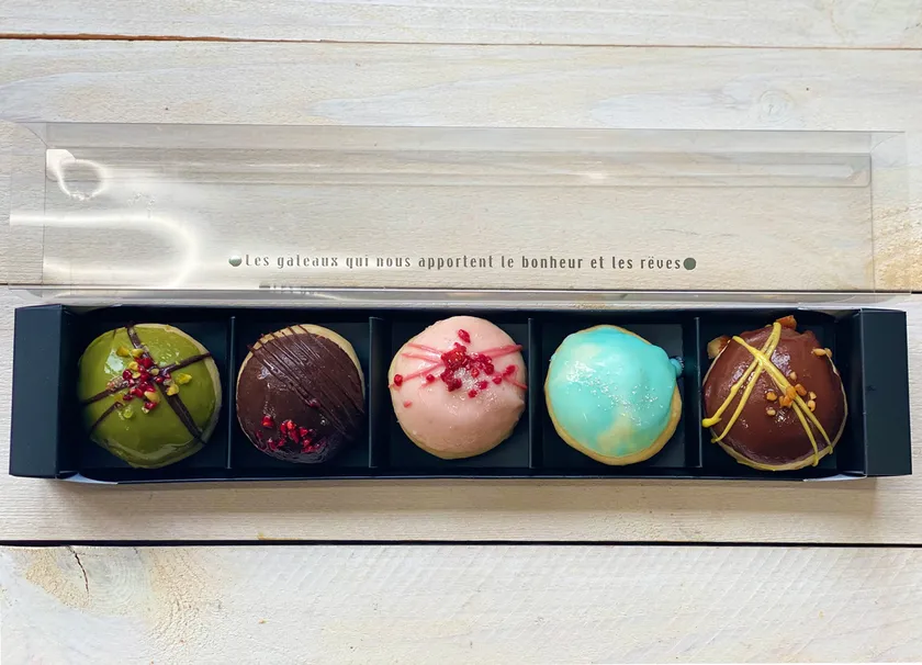 中のクリームは5種類あり(ピスタチオ・チョコ・いちご・レアチーズ・栗)味の違いもお楽しみいただけます。お子様や女性もひと口で食べられるサイズの、華やかでおしゃれなスイーツです。