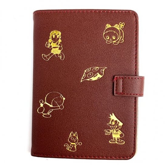 高級感のあるブラウンに、ドラえもんたちキャラクターが金押しされたマスク&ティッシュケースです。表面だけでなく裏面にも、ドラえもんやのび太、ドラミちゃんなどのキャラクターがデザインされています。