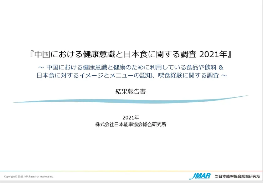 株式会社日本能率協会総合研究所(JMAR)は、経済成長を続ける中国における健康意識と利用されている健康食品を把握すること、また経済発展にともない近年多くの中国人観光客の訪日によって人気が高まっているといわれる日本食のイメージと浸透しているメニューなどを把握することを目的に『中国における健康意識と健康のために利用している食品や飲料&日本食に対するイメージとメニューの認知、喫食経験に関する調査』を、2021年4月から5月にかけて実施し、調査結果を公開したことをお知らせいたします。