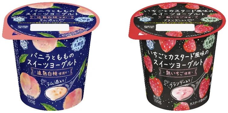 『バニラともものスイーツヨーグルト』は、バニラ風味のヨーグルトに、追熟した白桃(一部使用)を合わせ、隠し味にラム酒を使用し、『いちごとカスタード風味のスイーツヨーグルト』は、カスタード風味のヨーグルトに、熟したいちごを合わせ、隠し味にブランデーを使用しました。