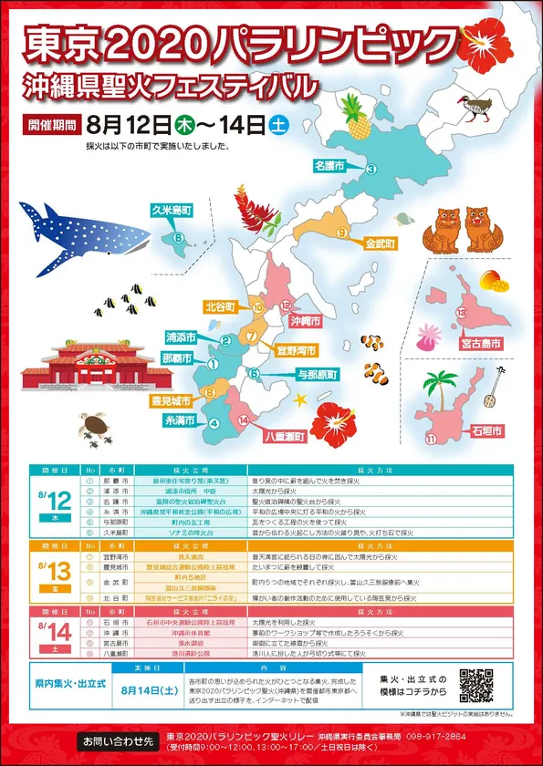 YouTubeでは、8月12日~14日の間に沖縄県内各地で採火を行った様子の他、14市町から集められた火をひとつに集火し、開催都市である東京都へ送り出した集火・出立式の様子が配信されています。