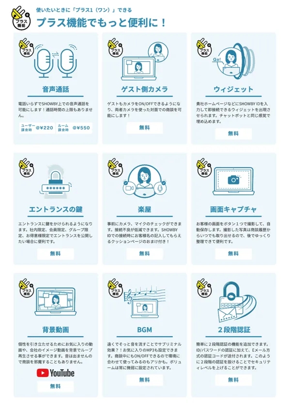 ニーズに合った機能を取捨選択して組み込める「プラス機能」や、バーチャルエントランスのカスタマイズで、これまでのWeb商談ツールよりも使いやすくグッと親しみやすく、そして愛着を持っていただけるものになっています。