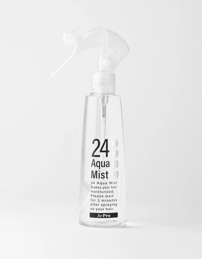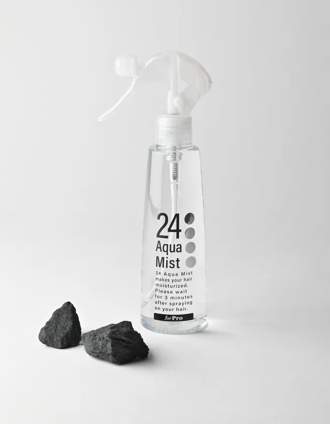 「24アクアミスト」は大学などの研究室で細胞や血液を培養する際に使われる不純物を一切取り除いた超純水に天然鉱石ブラックシリカを漬け込みイオン化したミネラル機能水に音波の波長によって活性化させたフリーエレクトロン(自由電子水)でできたヘアミストです。傷んだ髪の修復をコンセプトに、昭和薬科大学の准教授、かつ日本珪素医学会の理事であり未病総合治療院院長でもある小野寺敏医学博士と毛髪診断士が共同で開発しました。ベースとなる水はナノよりも小さいオングストロームサイズまで分解し、髪の内部まで浸透。髪の深部であるコルテックス毛皮質まで作用し、髪にしっかりと潤いを届け、艶とコシをよみがえらせます。