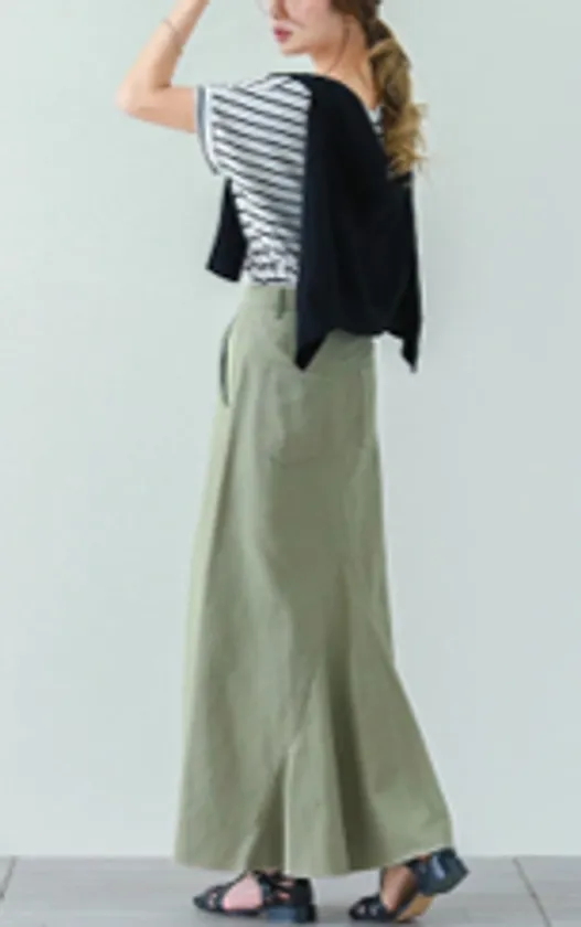 フロントはシンプルなタイトシルエット、バックはパネル切り替えのフレアデザインがアクセントの後ろ姿も抜かりないロングスカート。ハイウエストで嬉しい脚長効果も。