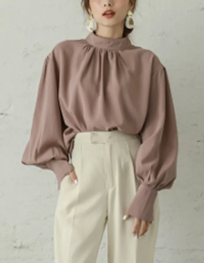 クラシカルな印象のハイネックと上品で華やかなボリュームスリーブが女性らしい大人キレイめなブラウス。柔らかくとろみ感のある生地で着心地が良く、華奢さとシャープ感を添える幅広カフスや同系色のボタン2つがアクセントのバックネックデザインなど、細部にまでこだわった特別な1枚です。オケージョンシーンはもちろんのこと、下にデニムを合わせてカジュアルダウンさせた着こなしも、こなれ感のあるデイリーユースとしておススメです。