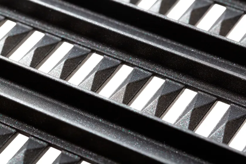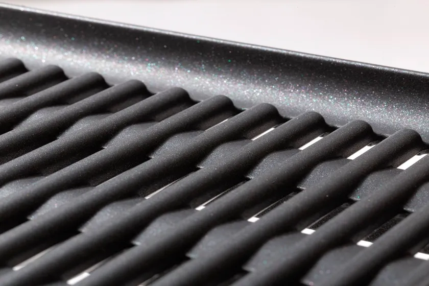 煙や臭いなどが発生する原因は、プレートに残ったお肉の脂やプレートに塗った牛脂やサラダ油など、余分な油が高温で燃焼することにあります。そこで、プレート裏面を、業界初の独自構造である立体的な“X”の形状にすることで、油の流れを下側に集中させ、効率的に油を落とすことで、煙の発生と油ハネを抑えます。