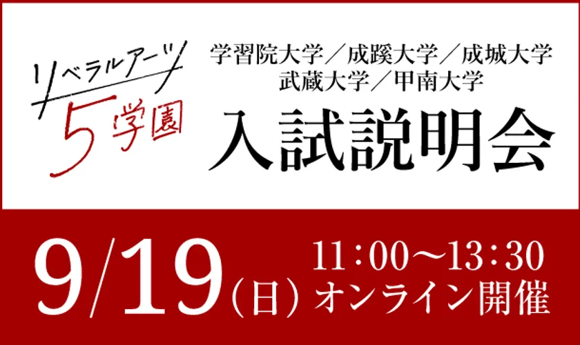 学習院大学・成蹊大学・成城大学・武蔵大学・甲南大学の5大学で構成される「リベラルアーツ5学園」は、旧制高等学校をルーツに持ち、現在も総合的な人間力を養うリベラルアーツ教育を実践しているのが特長です。この5学園が、9月19日(日)、「リベラルアーツ5学園 入試説明会」をオンラインで開催します。