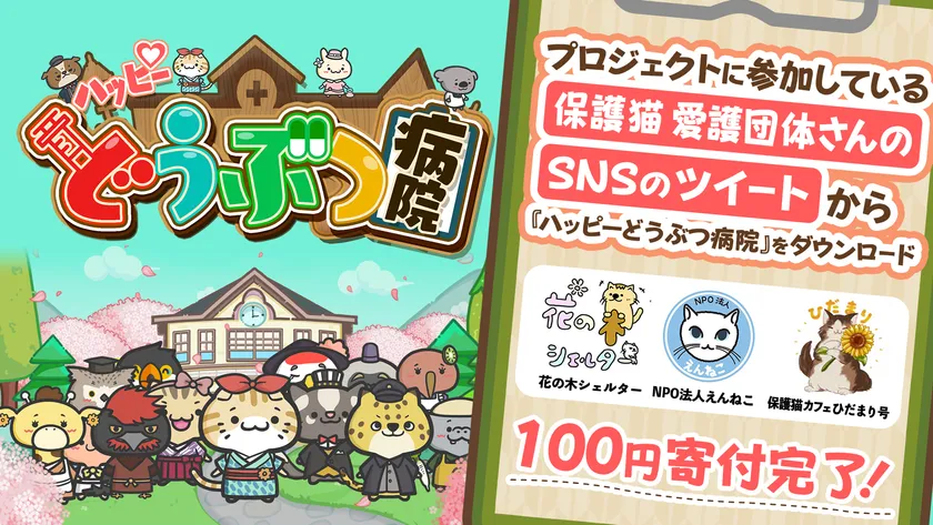 『ハッピーどうぶつ病院』グローバル30万ダウンロード突破! ダウンロードを通じて猫の保護活動に寄付できる、 「1ダウンロード=100円寄付プロジェクト」を開始!