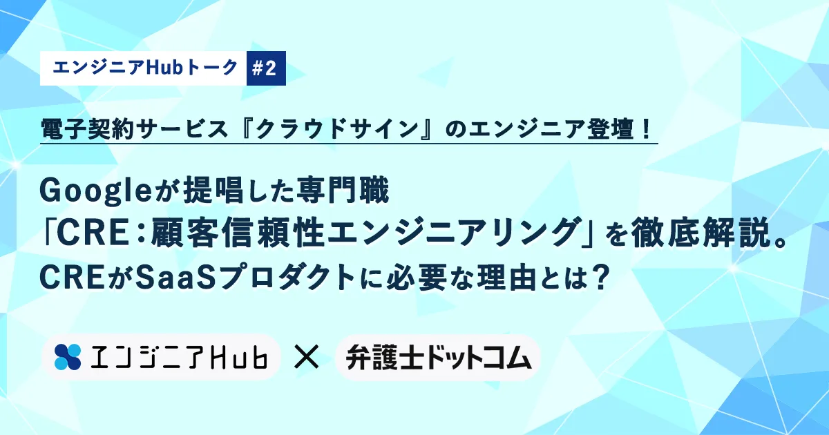 人材採用・入社後活躍のエン・ジャパン株式会社(本社:東京都新宿区、代表取締役社長:鈴木孝二)が運営するエンジニア向け転職サイト『エンジニアHub』(https://eh-career.com/)は、電子契約市場No.1(※)の電子契約サービス「クラウドサイン」 (https://www.cloudsign.jp/)を提供する弁護士ドットコム株式会社との共催で、エンジニア向けオンラインセミナー “電子契約サービス『クラウドサイン』のエンジニア登壇!Googleが提唱した専門職「CRE:顧客信頼性エンジニアリング」を徹底解説。CREがSaaSプロダクトに必要な理由とは?” を2021年9月29日(水)18時よりLIVE配信いたします。