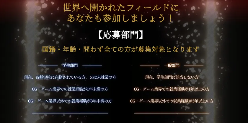 【学生】、及び【一般】のそれぞれの部門で作品を募集し、世界中のアーティストたちがVFXの表現を競い合う、ワールドワイドなコンテストとなります。