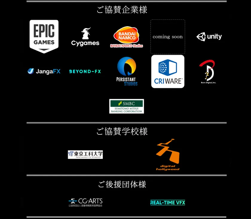 本コンテストは、世界から注目を受ける、格式あるVFXコンテストしての立ち位置を目標として、毎年継続的に実施する予定であり、現在ゲーム・3DCGデザイン業界で大きな影響力を持つ企業・学校・団体様に協賛のご協力を頂いております。