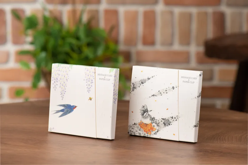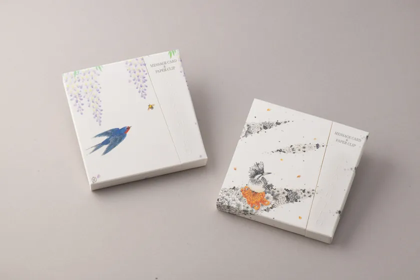 伝統息づく九谷焼作家の絵を、さりげなく暮らしの中に メッセージカード&紙製クリップ 「MESSAGE CARD&PAPER CLIP 藤と燕/山翡翠(ヤマセミ)」 新発売