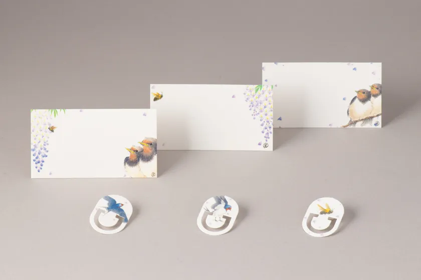 藤の花の側で子育てする燕の親子の成長の様子を表現しました。カードとクリップには親燕が蜂を捕まえて子燕に与えようとしたけれど逃げられてしまい、それを見つめる子燕のほのぼのとした様子を描きました。パッケージ裏面の藤の花を少し枯れた色で書き分け、自然の移ろいとともに子燕が成長していることを表現しています。