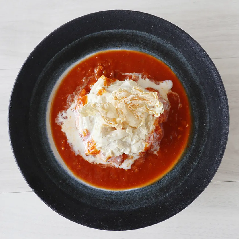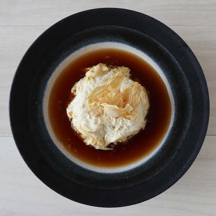原料は「畑の肉」とも呼ばれる栄養価の高い大豆ですから、良質なたんぱく質を多く含み、古くから精進料理などでは肉の代わりに食べられ栄養豊富な食材として親しまれてきました。ゆばに含まれるたんぱく質量は豚肉と比較しても引けをとらず、それでいて低脂質です※。そんな魅力たっぷりのゆばを、もっと日常的に楽しんでいただきたいと思い、考案したのが「ゆばボウル」。ゆばボウルは、豆庵とうふ工房で朝一番に汲み上げたとろとろの生ゆばとカリカリに揚げたゆばを、ヤマキ醸造の調味料を中心に厳選した素材でつくった温かいソースで有機米ごはんと一緒に食べることで、新しいゆばの味わいと2つの食感が楽しめます。