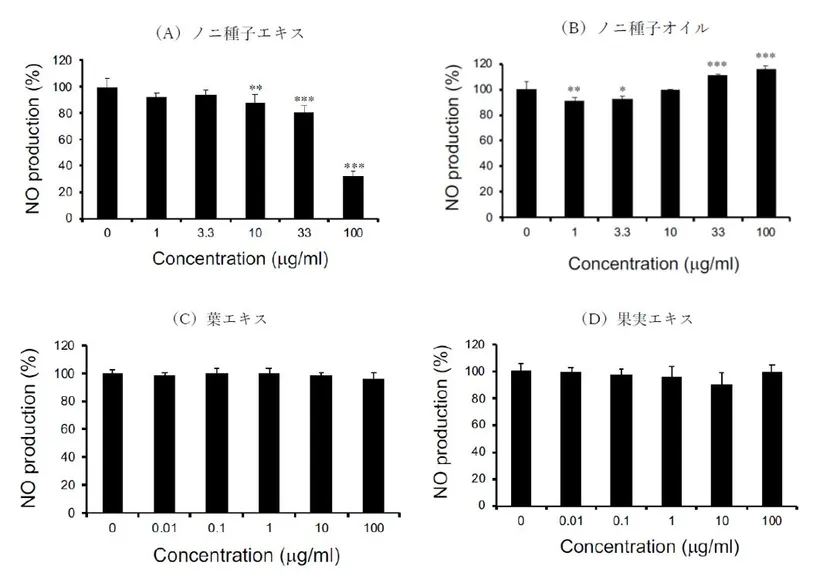 ノニ種子エキスは、細胞生存率に影響を与えることなく、NO産生を有意に抑制し、ノニ種子オイル、葉エキス、果実エキスよりも高い活性を示しました。【グラフ1】