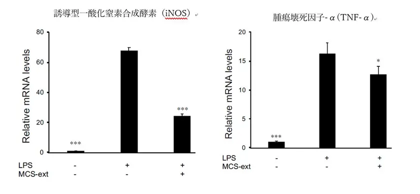また、ノニ種子エキスは、炎症性サイトカインの誘導型一酸化窒素合成酵素(iNOS)と腫瘍壊死因子-α(TNF-α)のメッセンジャーRNA発現を抑制することが分かりました。【グラフ2】