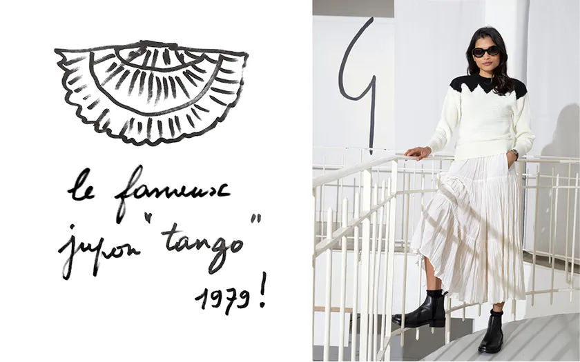 10月は、1979年に誕生した名品スカート「Tango」が今季コレクションでリバイバルし、エクリュカラーで登場します。踊るように揺れるドラマティックなシルエットは、いつの時代も色褪せない普遍的な魅力を演出。ノスタルジックな印象を醸す柔らかなコットンガーゼ素材は、かつてバターを包むのに使った布からのインスピレーションです。