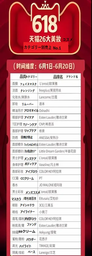 KATEもTmallの「618」で大きな成果をあげた日本ブランドの一つです。特に、アイブロウパウダーが発売されると、好評価の口コミは約7万6,000に達し、Tmall「618」の好評価ランキングで2位になりました。また、パウダリースキンメイカーは、オイルスキンリキッドファンデーション購入部門で1位を獲得。618期間中にブランド旗艦店の累積売上高は1,000万元を超え、前年比13%増になりました。