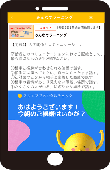 介護福祉国家試験の過去問がSNSタイムラインに毎日配信されます。また、施設独自のマニュアルやルールを配信。