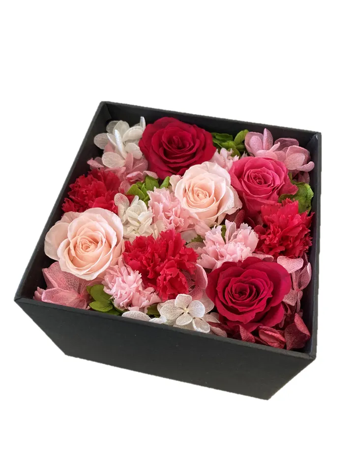 「プリザーブド」 (preserved) は、「保存された」という意味です。プリザーブドフラワーとは、生花の一番美しい時期に色素を抜き取り、特殊な加工を施したお花のことです。長期間保存することが可能で、豊富なカラーバリエーションを楽しむことができます。