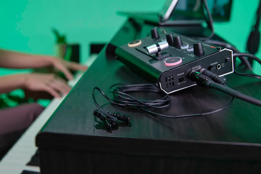 『V-02HD MK II』は、ローランドが業務用オーディオ・ミキサーの開発で培った技術を用いた10チャンネルのデジタル・オーディオ・ミキサーを搭載。3.5mmジャックを使用するプラグイン・パワー対応のオーディオ入力を2系統装備しているので、マイク、スマートフォン、オーディオ・ミキサー、その他のデバイスからのオーディオをサポートします。HDMI入力からの音声を、オーディオ入力と一緒にミキシングすることもできます。