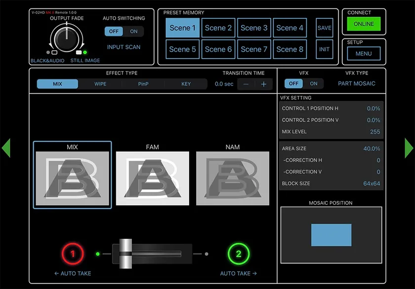 『V-02HD MK II』は、本体だけで映像の切り替えや音声のレベル調整などを行えますが、さらに外部モニターを接続することで、映像エフェクトや合成の設定、音声の調整などすべての機能を操作できます。また、iPad、macOS/Windows用のリモート・コントロール・アプリケーション「V-02HD MK II Remote」を使用すると、グラフィカルな画面で直感的に操作できます。