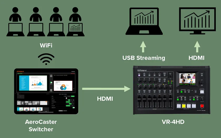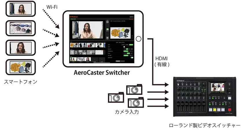 『AeroCaster Switcher』は、お手持ちのiPadにインストールすることで、ローランド製ビデオ・スイッチャーのカメラ入力にスマートフォンのカメラなどをワイヤレスで拡張できるiPad専用アプリです。『AeroCaster Switcher』をインストールしたiPadをローランド製ビデオ・スイッチャーのHDMI入力に有線接続して、ワイヤレスで受信したスマートフォンやタブレットのカメラ映像を切り替え/合成できるほか、パソコンやモバイル・デバイスの画面を共有することもできます。