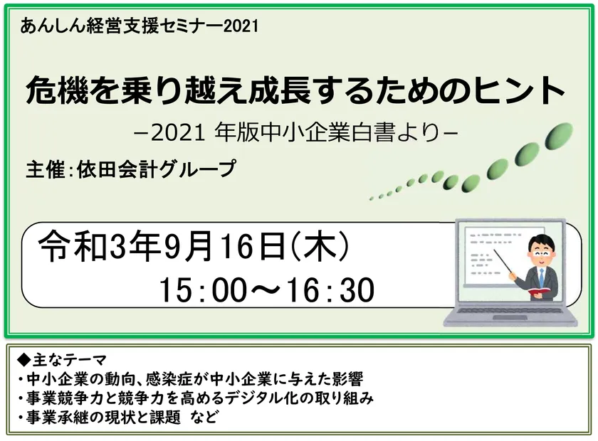 依田会計グループ(税理士法人依田会計・株式会社フシ総合研究所、本社:東京都新宿区、代表:馬場 広之)は、2021年版中小企業白書を解説するセミナーを『危機を乗り越え成長するためのヒント』と題して、2021年9月16日にオンラインで開催いたします。