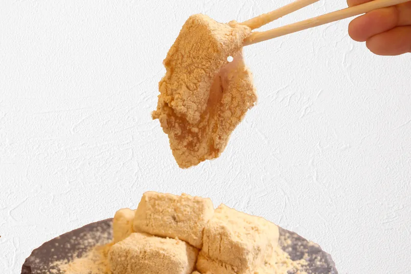 山菜のわらびの根の部分10kgから、わずか70gしか採れない、貴重な本わらび粉を使用しています。材料の配合や炊き方など試行錯誤を重ね、究極なやわらかさを追求し「とろとろ食感」が生まれました。爪楊枝が刺さらない程にやわらかいため、割りばしを添えて提供しています。プレーンの「和三盆」、食感のアクセントに北海道・十勝産のあずきを練り込んだ「あずき」の2種類をご用意しております。たっぷりとまぶした甘さ控え目なきな粉と一緒にお召し上がりください。