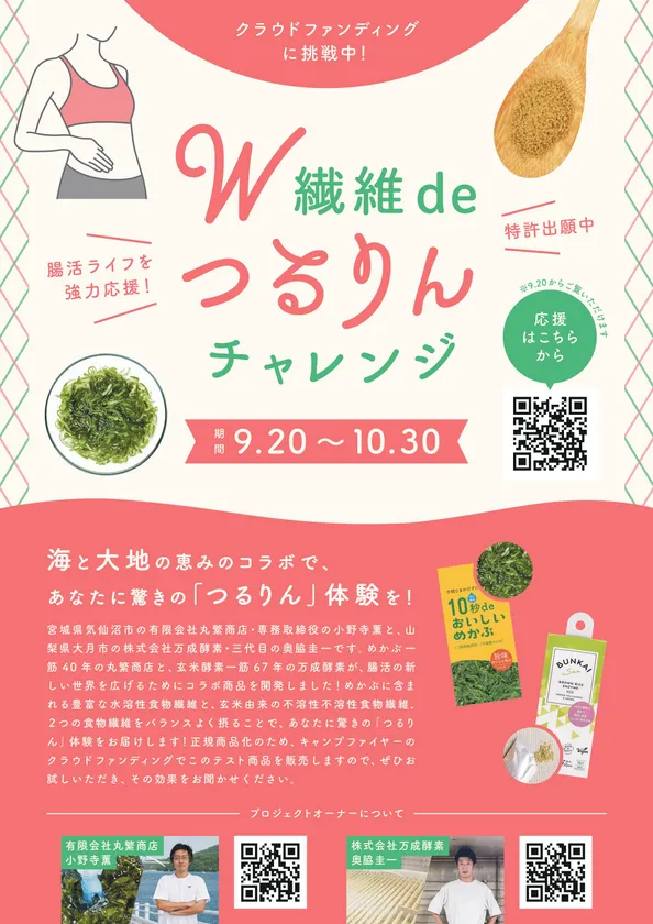 リターンとして、丸繁商店自慢の新製品「10秒deおいしいめかぶ」14パック(1パック40g×14日分)と、万成酵素自慢の玄米酵素新製品「BUNKAI-San」42包(1包2.5g×1日3包×14日分)をセットにした「W繊維deつるりんチャレンジBOX」を、送料込みの5,500円でご提供します。