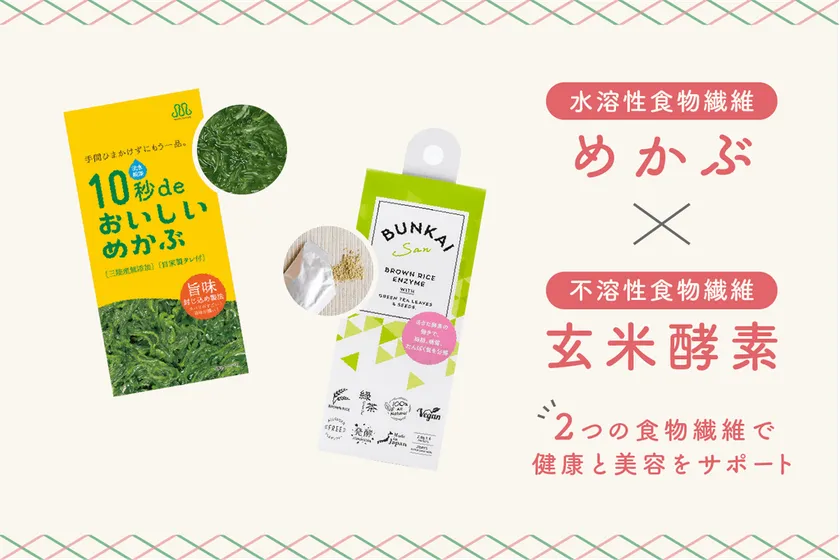 「めかぶ」一筋40年の丸繁商店、「玄米酵素」一筋67年の万成酵素、扱う商品こそ違いますが、おいしくて健康に役立つものでみなさまに喜びの輪を広げたいと、丹精こめた商品づくりに長年取り組んできました。このたびタッグを組んで、腸活ライフを強力に応援するコラボ商品「W繊維deつるりんチャレンジ」を作りました。