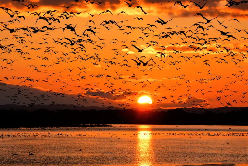 1985年に水鳥と湿地の保存を目的とした国際条約「ラムサール条約」に指定された伊豆沼(宮城県)は、秋から冬にかけて10万羽以上の渡り鳥が越冬のため飛来します。鳥たちが日の出直後の朝焼けの中を一斉に飛び立つという条件は年に何度足を運んでもそう出会えるものではないため、夢中でシャッターを切りました。