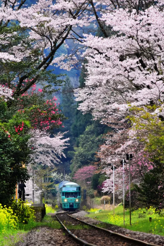 桜や桃、菜の花といった美しい花々が咲き乱れる豊後中川駅(大分県)。三度目の正直となる今回、過去の訪問では叶わなかった色とりどりの花々で賑わう駅の姿が見られました。当日は天気にも恵まれ、撮影に励む沢山のカメラマンに交じって撮影した中から特急ゆふいんの森号との一枚を選びました。