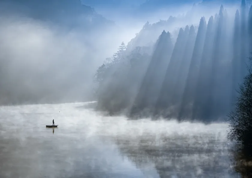 釣り愛好家に知られる笹川湖湖畔(千葉県)は公園や散策路があり、自然を楽しめる場所です。日の出前後の魚がよく釣れるといわれる「朝まづめ」の時間帯、悠々と釣りを楽しむ方の姿を見て車を止めました。冷え込みで水面に立ち昇る霧の神々しさに思わずカメラを構え、朝日が差し込んだタイミングで撮影しました。