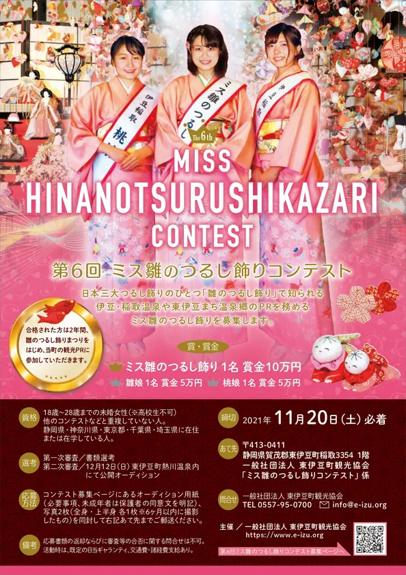 「ミス雛のつるし飾り」に選ばれた方には、賞金10万円が授与され、2年間の任期中は、「雛のつるし飾りまつり」をはじめ、東伊豆町の観光PRにご参加いただきます。